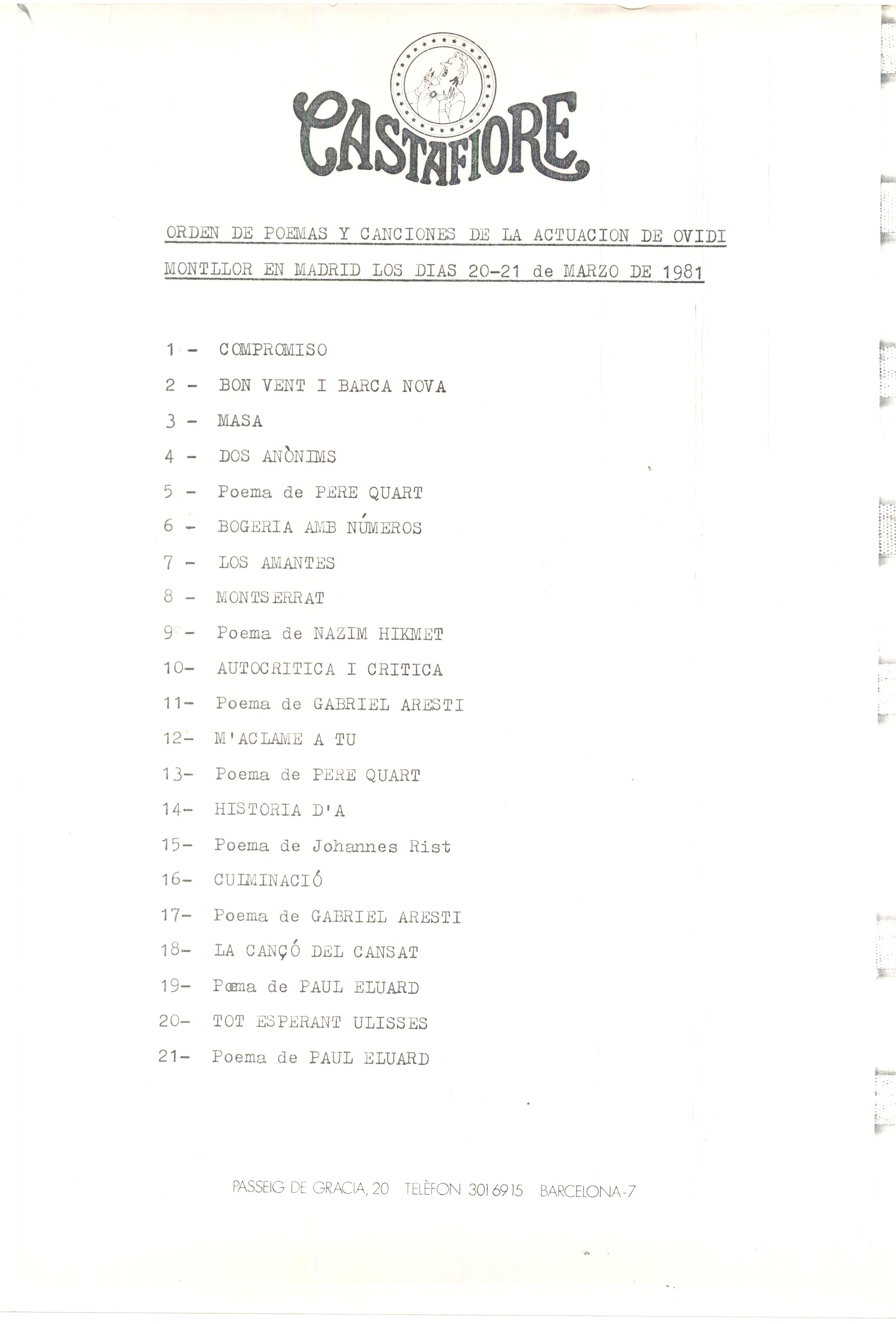 Mecanoscrit. 94 fulls. Carpeta. Muntatge per actuació a Madrid d’O. M. Inclou llistats de cançons, 2 programes de mà, presentacions de les cançons i traduccions de poemes al català, inclou poemes d’altres autors musicats per O. M. Entre altres Perquè vull; La fera ferotge; Als nous amos; Dos anònims; Als companys etc...