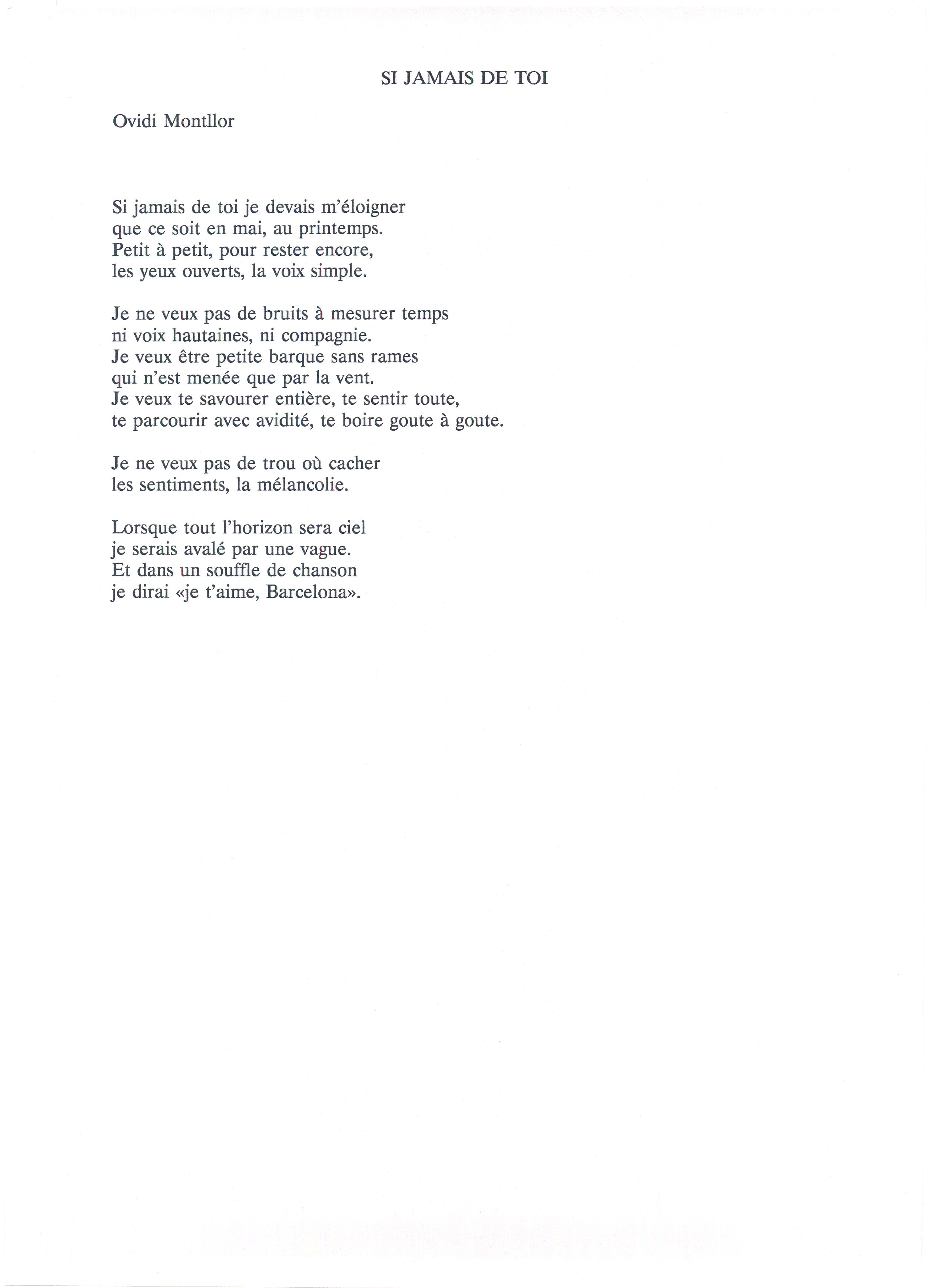 Patronat Català Pro, Europa. Barcelona Chanson. Ovidi Montllor. Toti Soler. Jordi Ruiz. Mecanoscrit. 48 fulls. Carpeta. Poemes traduïts al francés. Inclou retall de premsa de l’actuació, guió de l’acte amb les lletres de les cançons, les cançons en català. Anotacions manuscrites. Inclou poemes d’altres autors musicats per O. M. Entre altres Perquè vull; Autocrítica i crítica; Si mai de tu etc...